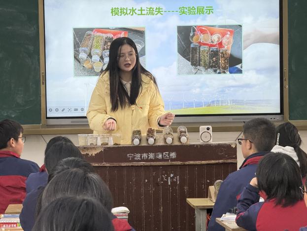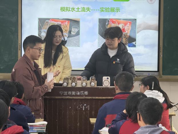 接下来,研究生同学们化身助教团队,在15-20分钟的动手实践环节,通过两项趣味十足的微缩实验让同学们化身“生态修复实践者”。《模拟石漠化与生态修复对比实验》中,助教团队现场演示A组(碎石薄土模拟未治理状态)与B组(网格固土+乔灌草结合种植模拟治理后状态)的搭建过程,随后用烧杯模拟同等强度“暴雨”,同学们通过近距离观察两组模型的水土流失差异,直观感受到科学治理与艰苦奋斗相结合的巨大成效。