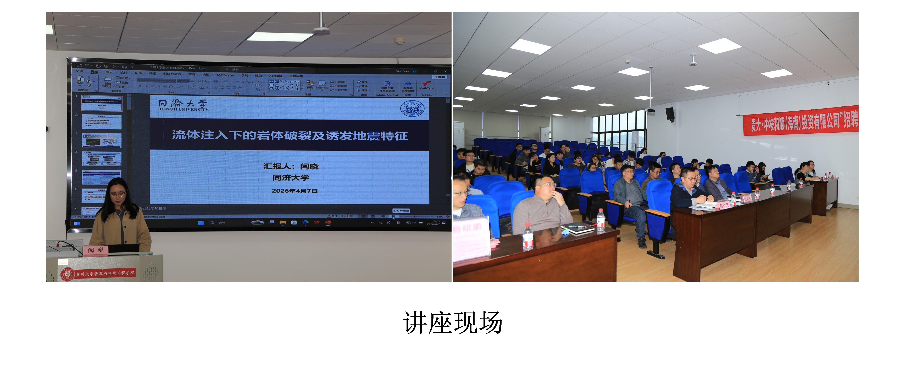 为促进学术交流,拓展师生视野,2026年4月7日下午15:00,同济大学航空航天与力学学院闫晓博士应地质工程教研室史文兵教授邀请来访我院,在521学术报告厅作《流体注入下的岩体破裂及诱发地震特征》学术讲座。讲座由学院陈世万教授主持,学院部分教师、博士生、硕士生参加。